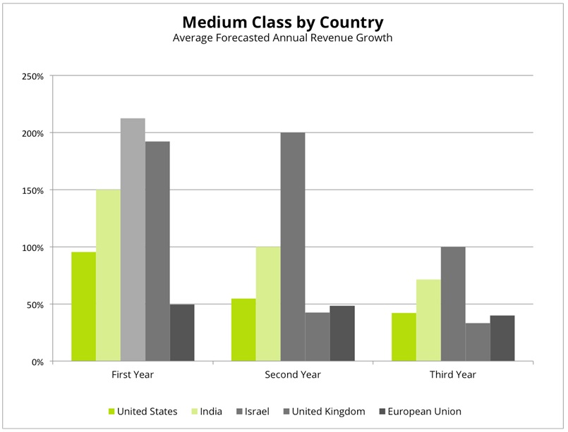 Naturally, companies in the small class have the largest growth percentages. Surprisingly though, they forecast final absolute numbers that are larger than the Medium and Large classes. We are observing this behavior very often. Companies that proved very little of their assumptions are extremely over-optimistic about their future. Then, as they test, iterate and grow, they learn how to better forecast their growth, and generally end up with lower projected revenues.